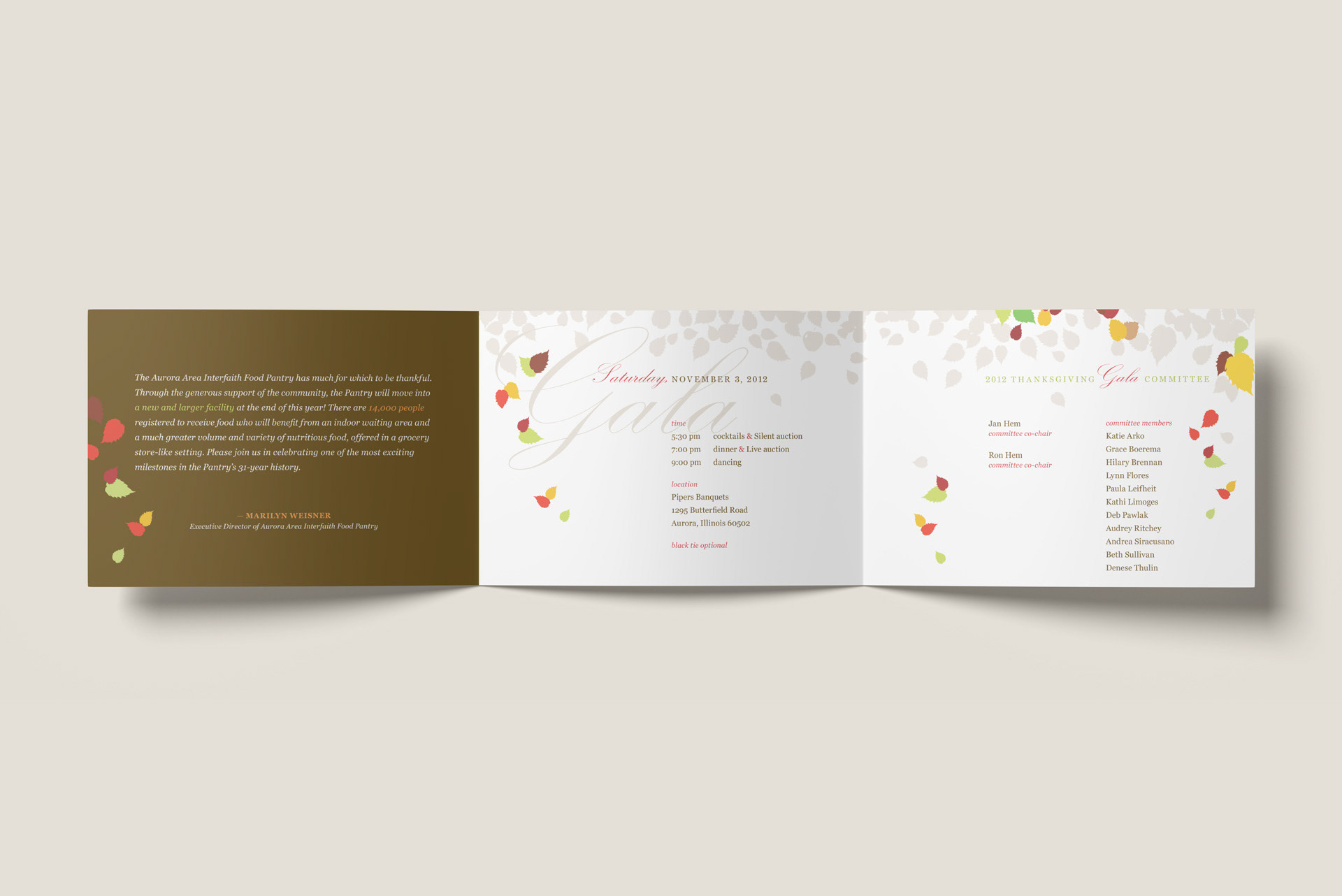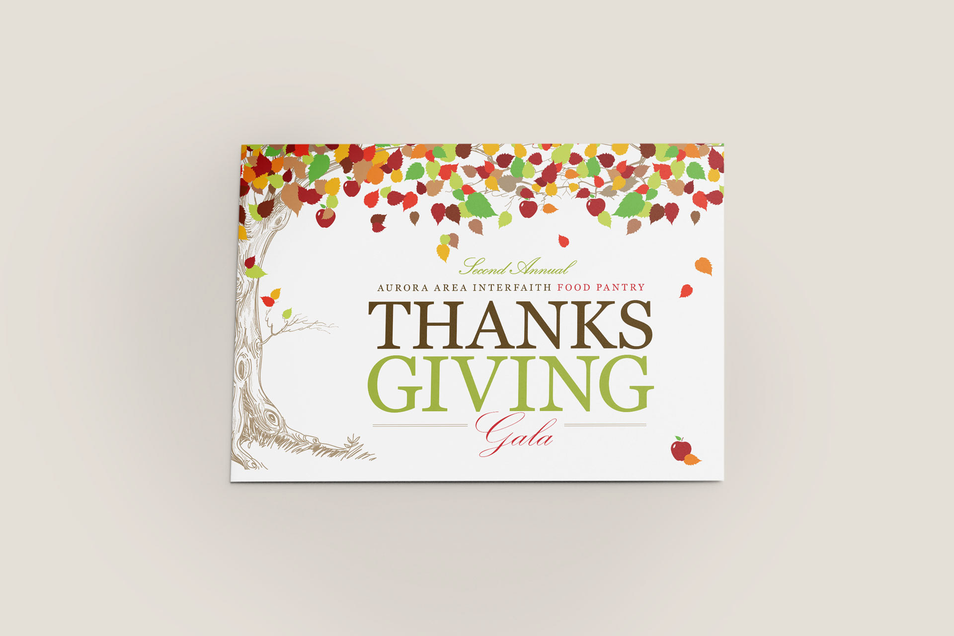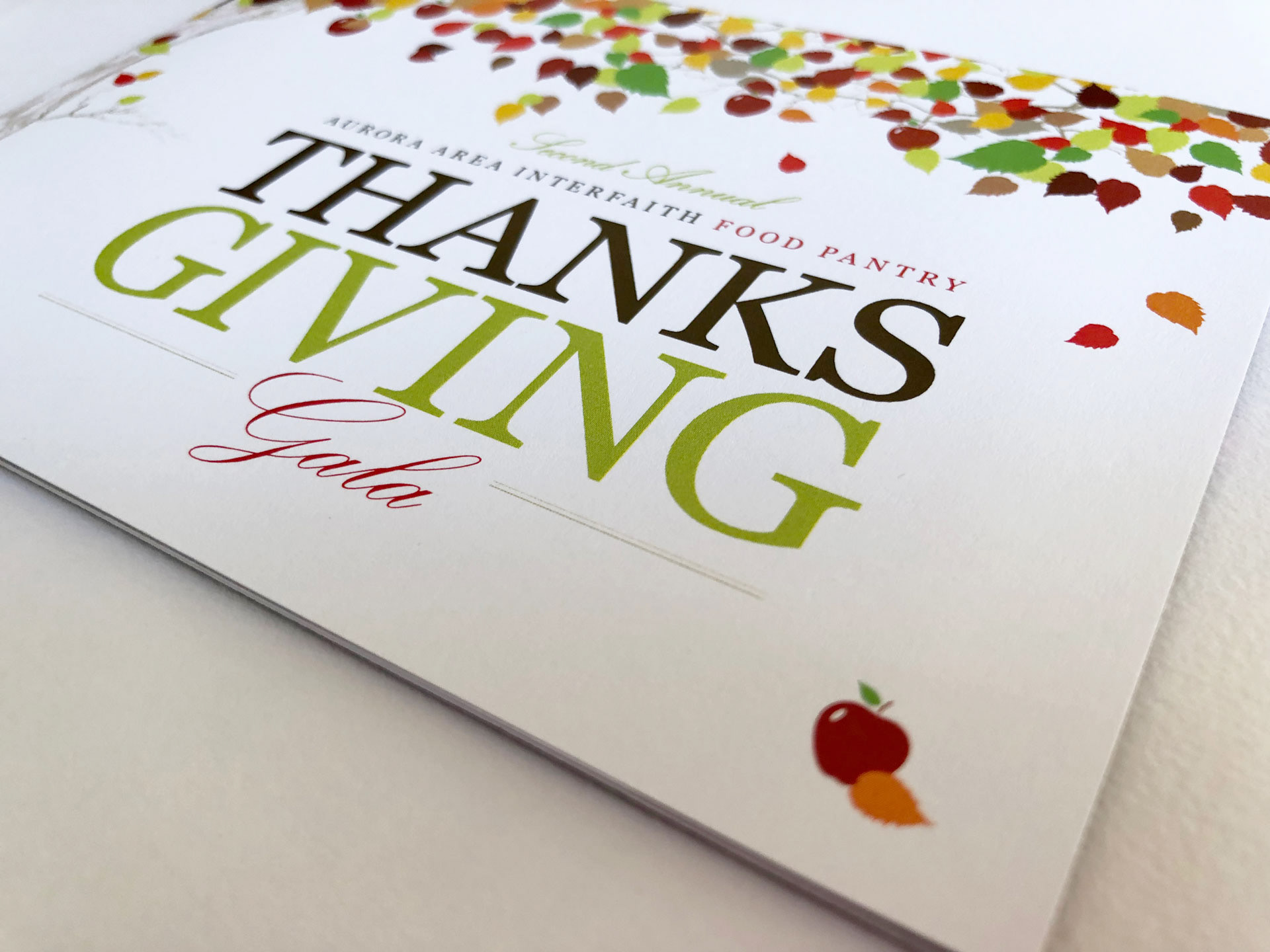Invitation design for the Aurora Area Interfaith Food Pantry Thanksgiving Gala. This is the pantry’s largest fundraising event of the year. By breaking “thanks” and “giving” we were able to put the emphasis right where we needed it.