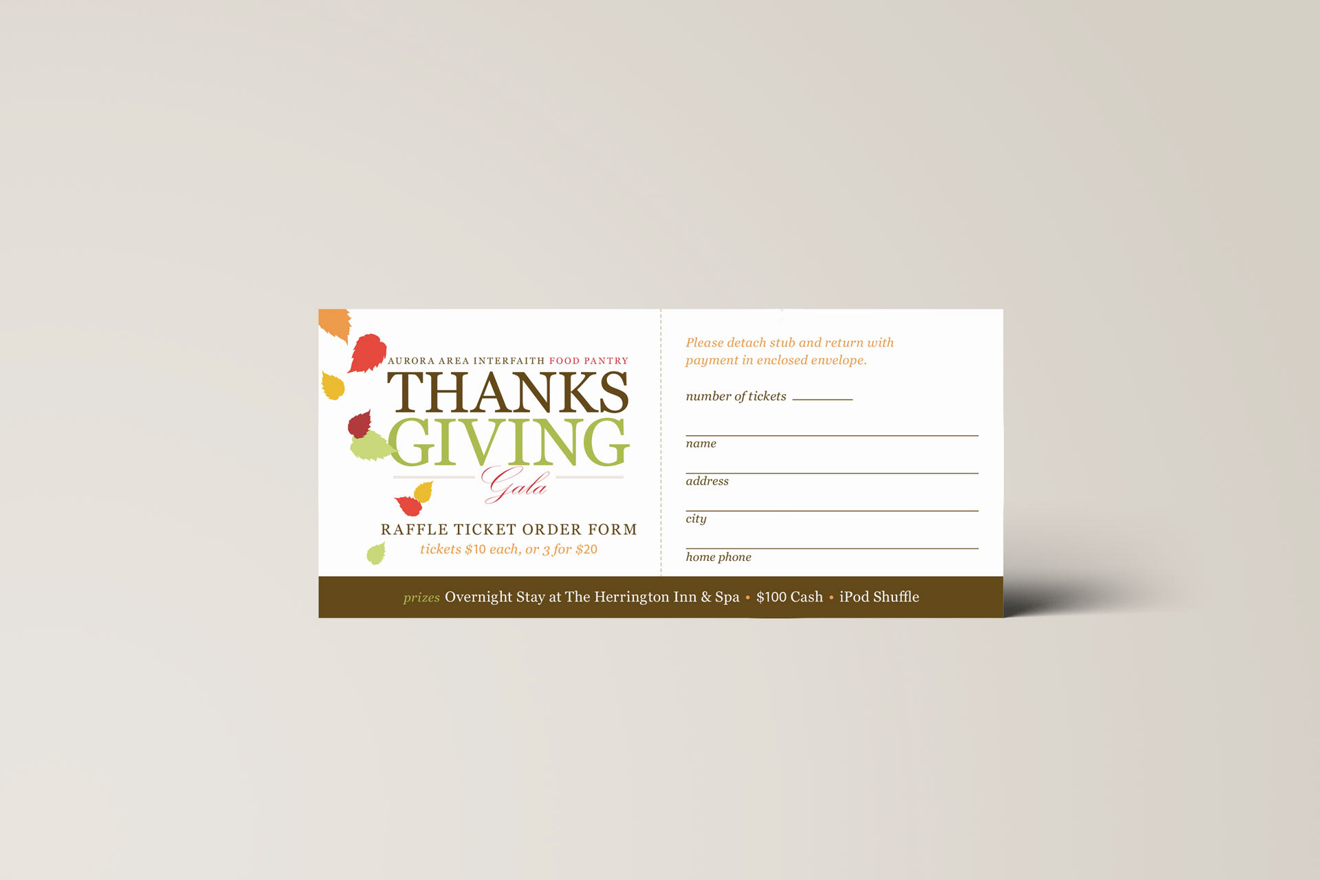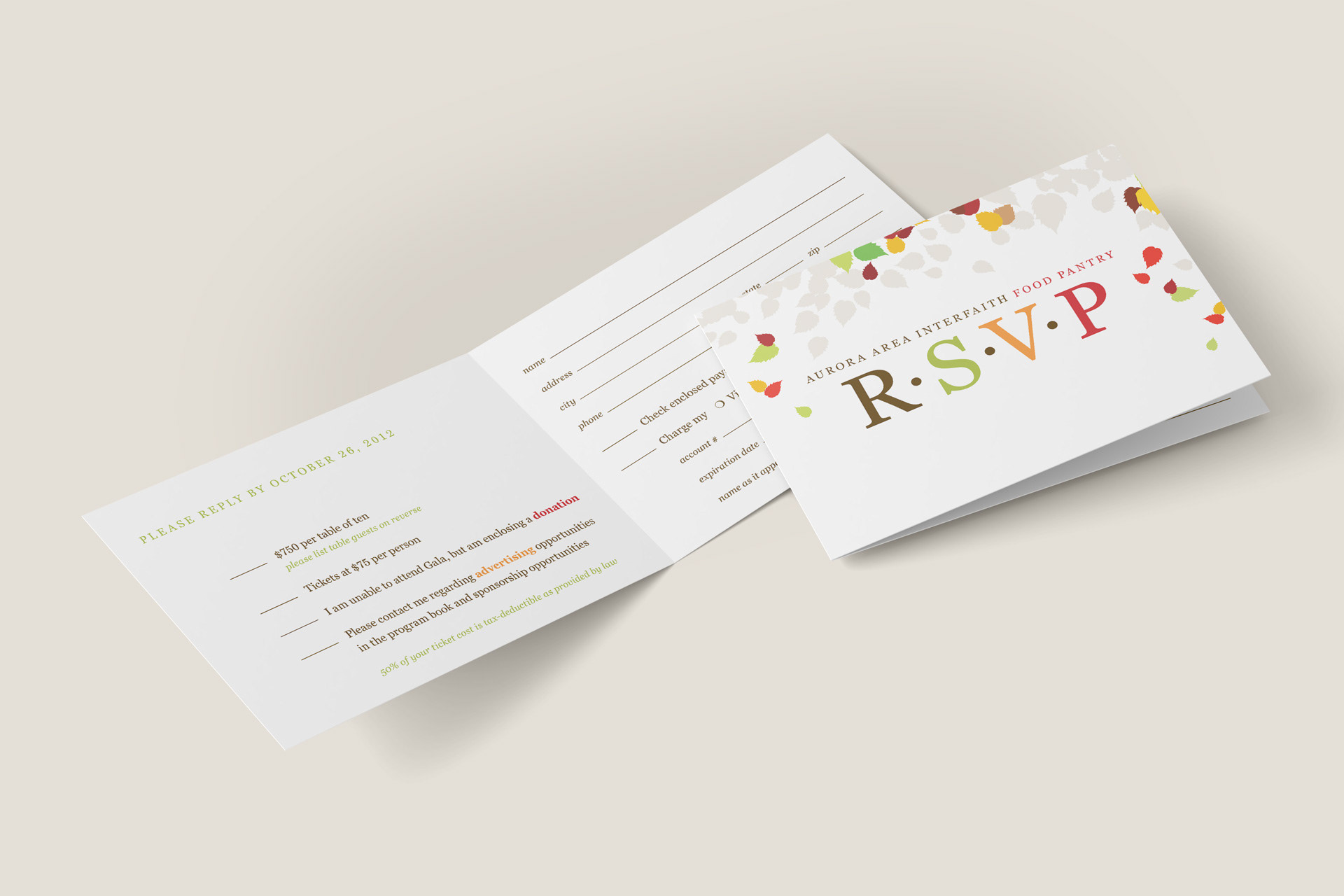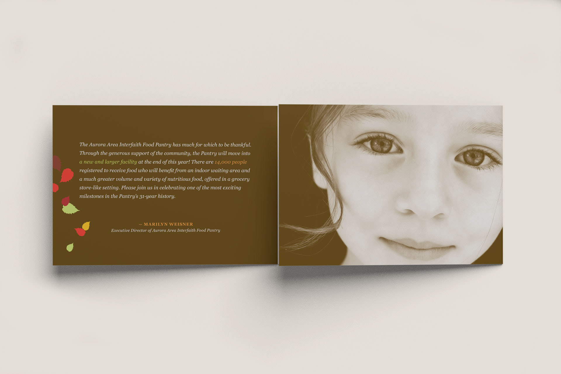 Invitation design for the Aurora Area Interfaith Food Pantry Thanksgiving Gala. This is the pantry’s largest fundraising event of the year. By breaking “thanks” and “giving” we were able to put the emphasis right where we needed it.